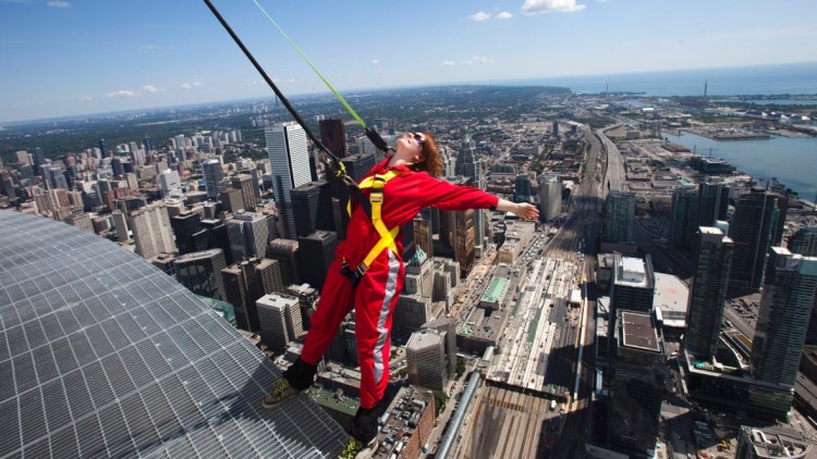 5. Mersul pe margine 💃 Nu ti-e frica de inaltime si ai drum pana in Canada? Da o fuga pana la CN Tower din Toronto si simte adrenalina la inaltime. La aproape 600 de metri inaltime, poti merge pe marginea turnului fara sa te tii de nimic, cu mainile libere, asigurat prin diferite coarde care te tin in siguranta. Costa 195 de dolari.